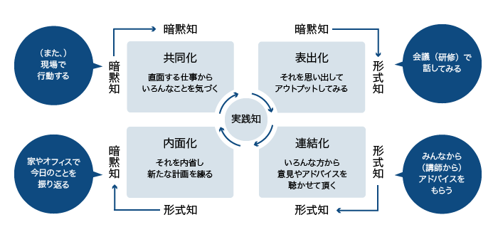 現場で行動する(共同化)→話してみる(表出化) → アドバイスをもらう(連結化) → 振り返る(内面化) → また現場で行動する(共同化)