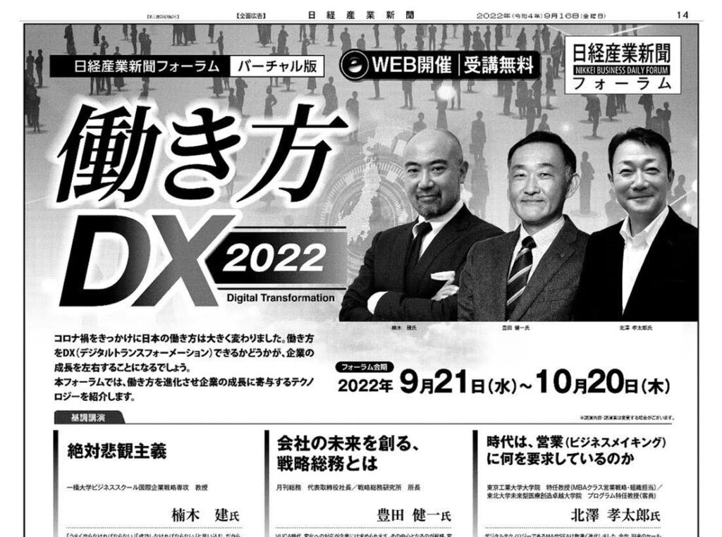 2022年9月~10月開催(オンライン)の 日経産業新聞フォーラム バーチャル版 働き方DX2022 にて、一橋大学ビジネススクール 国際企業戦略専攻 教授 楠木 建氏、月刊総務 代表取締役社長/戦略総務研究所 所長 豊田 健一氏と並び、基調講演を担当いたしま... -